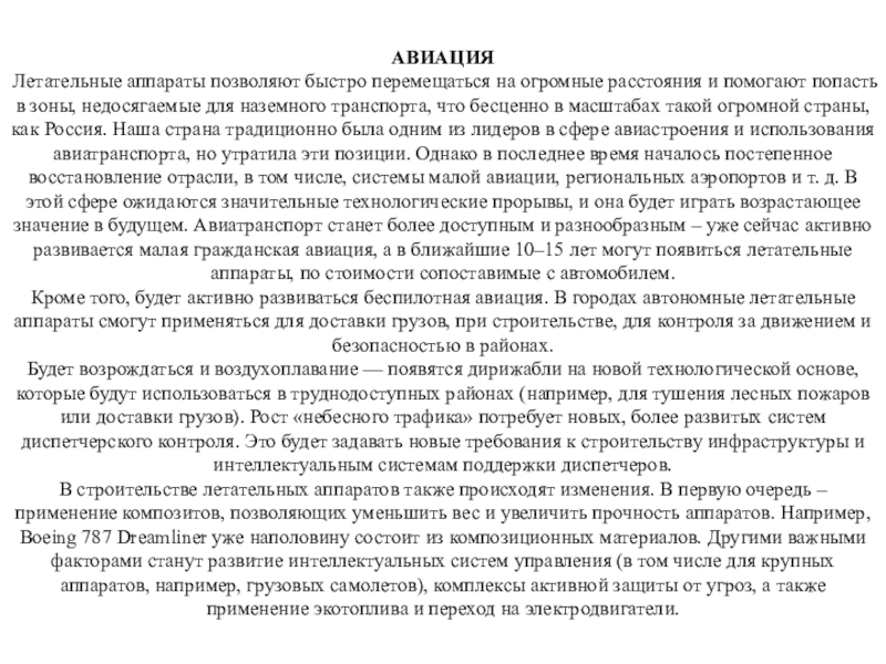 в зоны, недосягаемые для наземного транспорта, что бесценно в масштабах такой огромной страны, как Россия. Наша страна традиционно была одним из лидеров в сфере авиастроения и использования авиатранспорта, но утратила эти позиции. Однако в последнее время началось постепенное восстановление отрасли, в том числе, системы малой авиации, региональных аэропортов и т. д. В этой сфере ожидаются значительные технологические прорывы, и она будет играть возрастающее значение в будущем. Авиатранспорт станет более доступным и разнообразным – уже сейчас активно развивается малая гражданская авиация, а в ближайшие 10–15 лет могут появиться летательные аппараты, по стоимости сопоставимые с автомобилем.