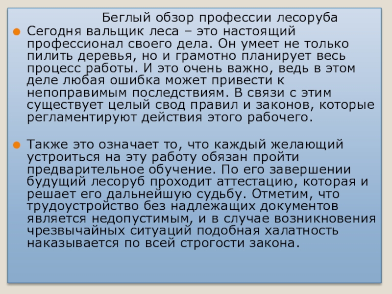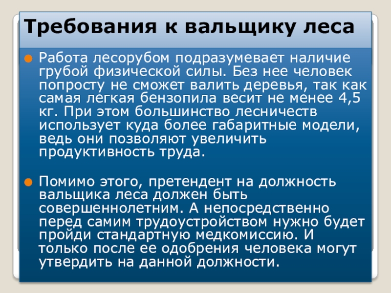 Слайд 14Требования к вальщику леса