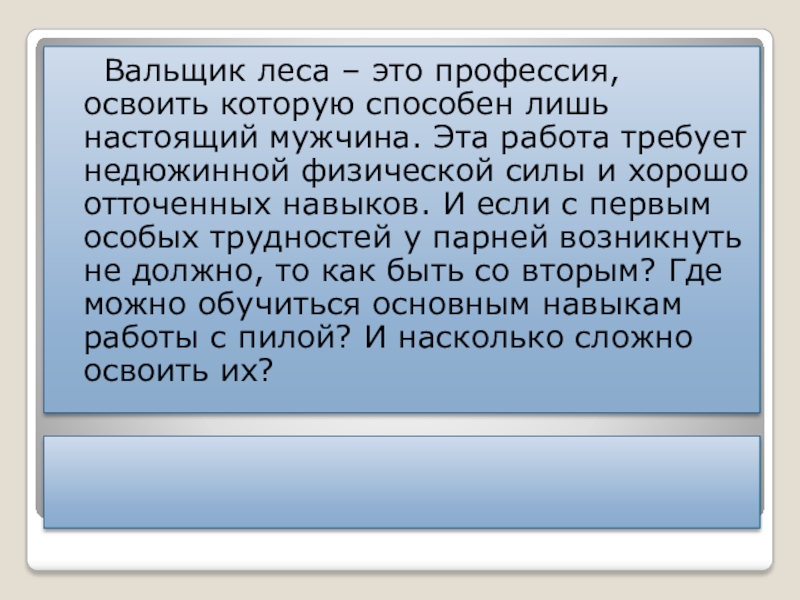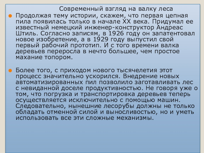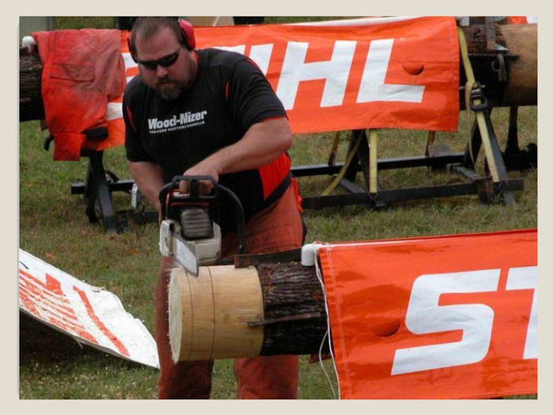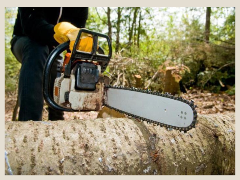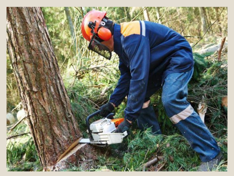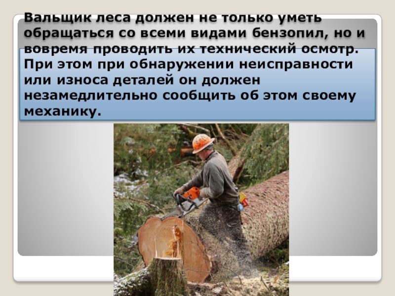 Слайд 13Вальщик леса должен не только уметь обращаться со всеми видами бензопил,