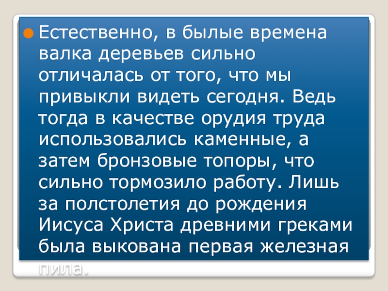 что мы привыкли видеть сегодня. Ведь тогда в качестве орудия труда использовались каменные, а затем бронзовые топоры, что сильно тормозило работу. Лишь за полстолетия до рождения Иисуса Христа древними греками была выкована первая железная пила.