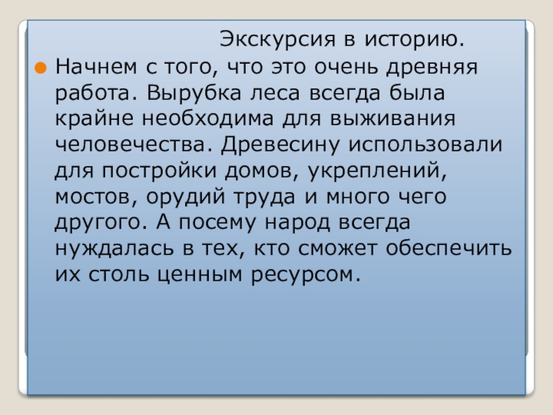 Начнем с того, что это очень древняя работа. Вырубка леса всегда была крайне необходима для выживания человечества. Древесину использовали для постройки домов, укреплений, мостов, орудий труда и много чего другого. А посему народ всегда нуждалась в тех, кто сможет обеспечить их столь ценным ресурсом.