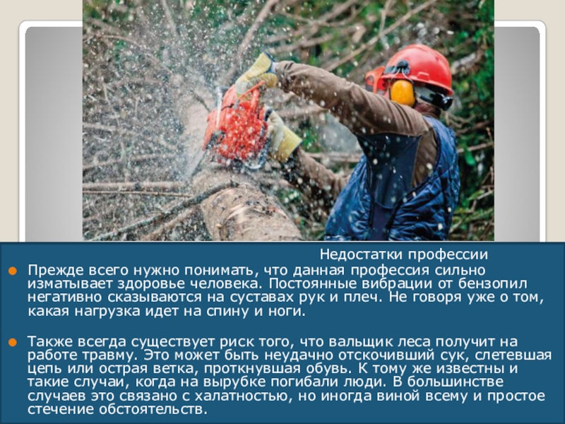 Прежде всего нужно понимать, что данная профессия сильно изматывает здоровье человека. Постоянные вибрации от бензопил негативно сказываются на суставах рук и плеч. Не говоря уже о том, какая нагрузка идет на спину и ноги.