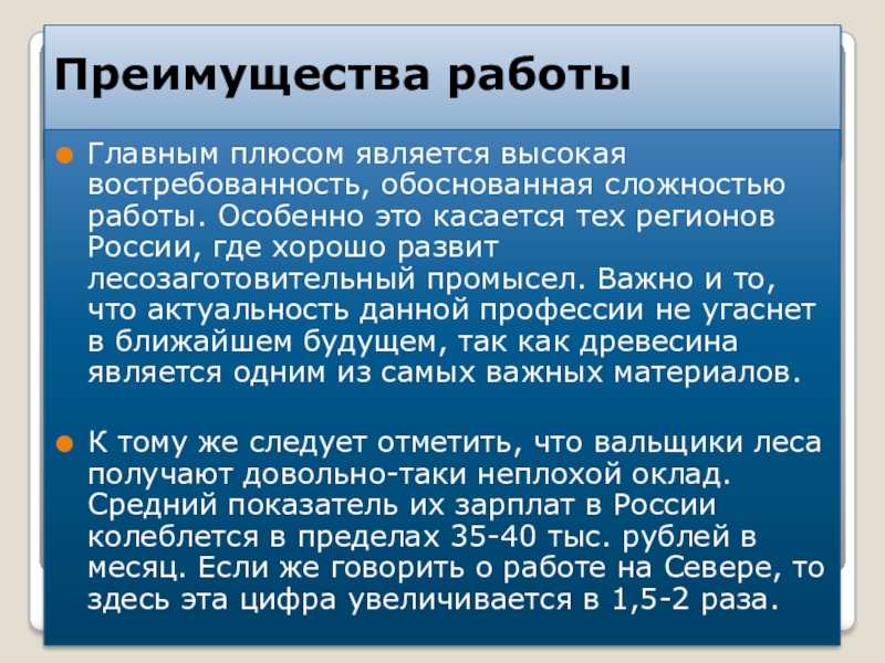 касается тех регионов России, где хорошо развит лесозаготовительный промысел. Важно и то, что актуальность данной профессии не угаснет в ближайшем будущем, так как древесина является одним из самых важных материалов.
