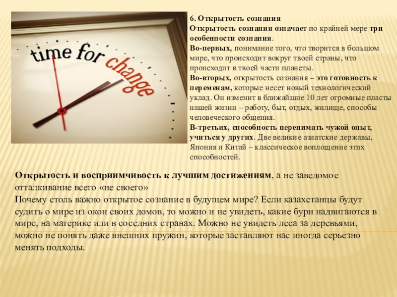 Почему столь важно открытое сознание в будущем мире? Если казахстанцы будут судить о мире из окон своих домов, то можно и не увидеть, какие бури надвигаются в мире, на материке или в соседних странах. Можно не увидеть леса за деревьями, можно не понять даже внешних пружин, которые заставляют нас иногда серьезно менять подходы.