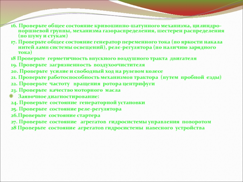 Слайд 916. Проверьте общее состояние кривошипно-шатунного механизма, цилиндро-поршневой группы, механизма газораспределения, шестерен