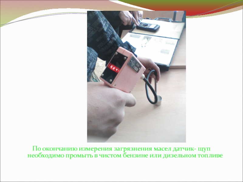 Слайд 25По окончанию измерения загрязнения масел датчик- щуп необходимо промыть в чистом