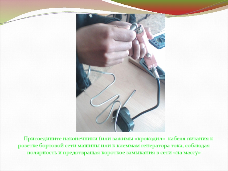 Слайд 22Присоедините наконечники (или зажимы «крокодил» кабеля питания к розетке бортовой сети