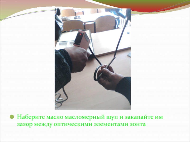 Слайд 24Наберите масло масломерный щуп и закапайте им зазор между оптическими элементами