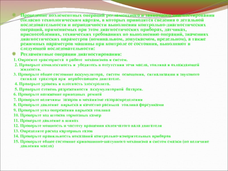 Слайд 8Проведение поэлементных операций регламентного и заявочного диагностирования согласно технологическим картам, в