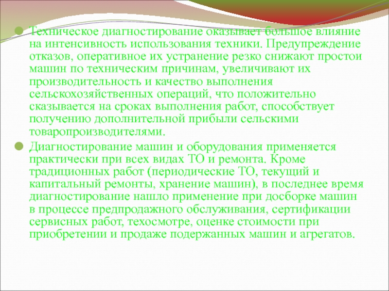 Слайд 6Техническое диагностирование оказывает большое влияние на интенсивность использования техники. Предупреждение отказов,