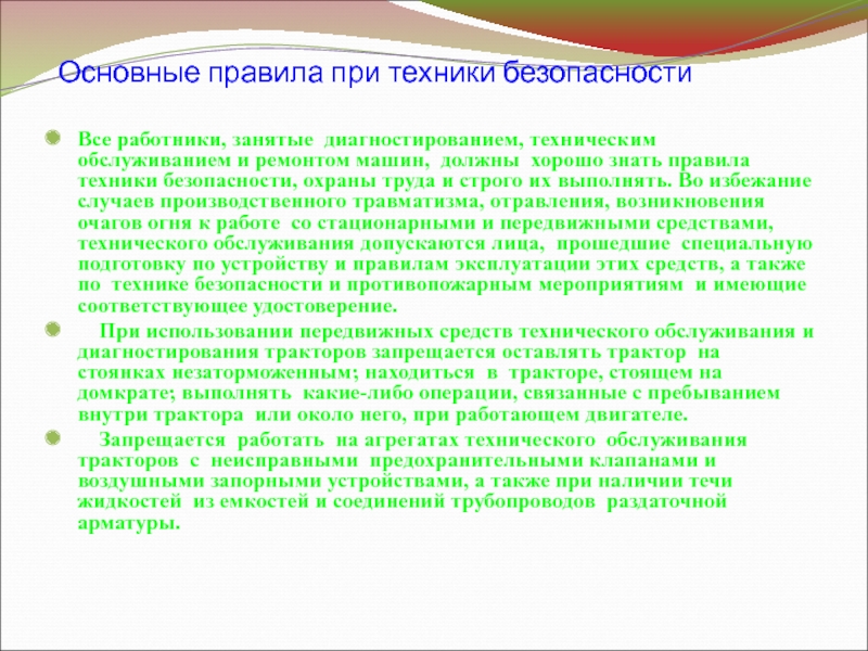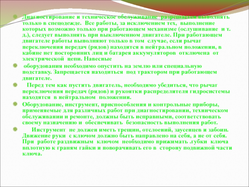 Слайд 27Диагностирование и техническое обслуживание разрешается выполнять только в спецодежде. Все работы,