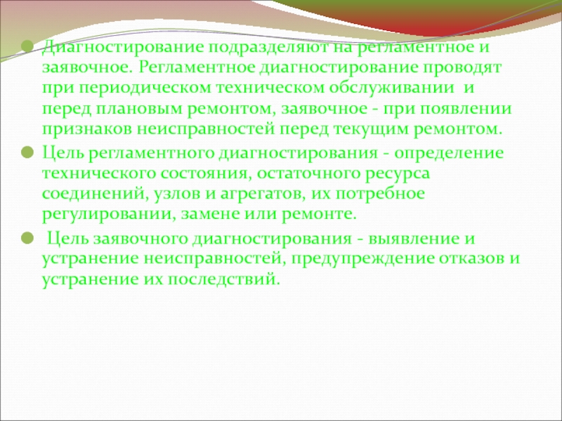 Слайд 7Диагностирование подразделяют на регламентное и заявочное. Регламентное диагностирование проводят при периодическом