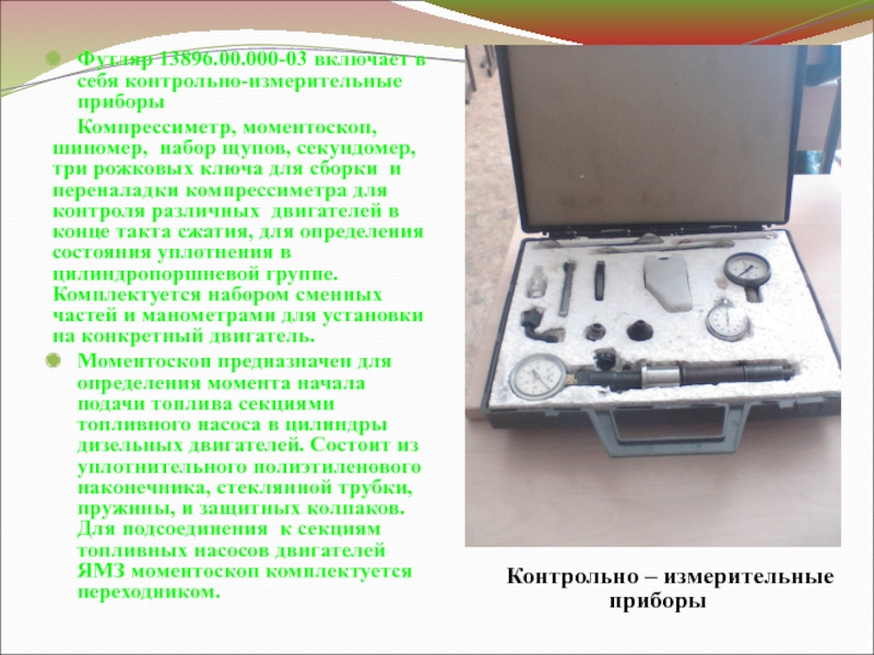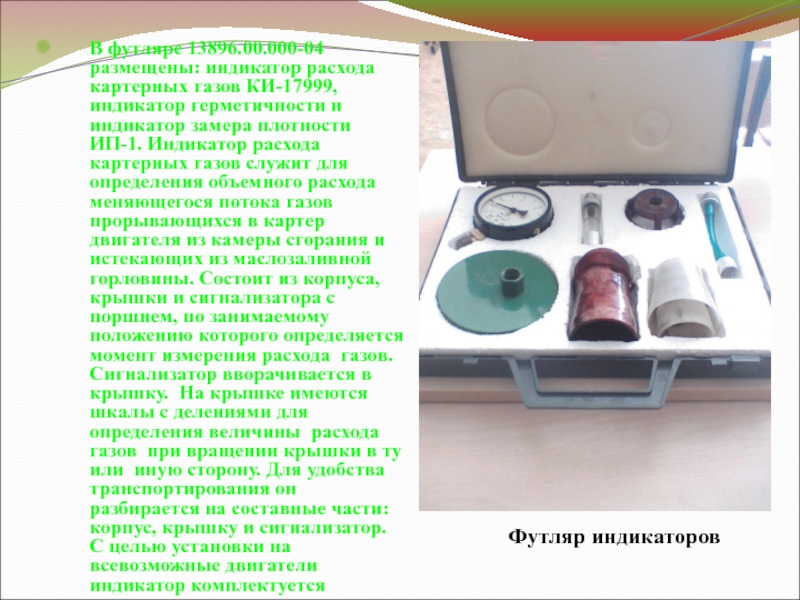 Слайд 18В футляре 13896.00.000-04 размещены: индикатор расхода картерных газов КИ-17999, индикатор герметичности