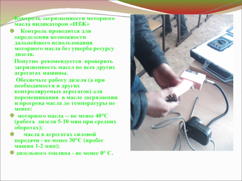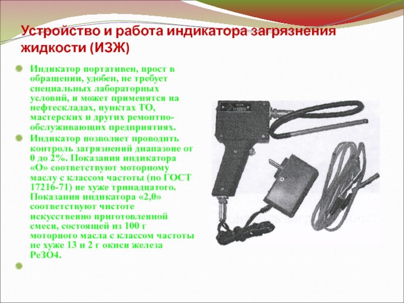 Слайд 20Контроль загрязненности моторного масла индикатором «ИЗЖ»