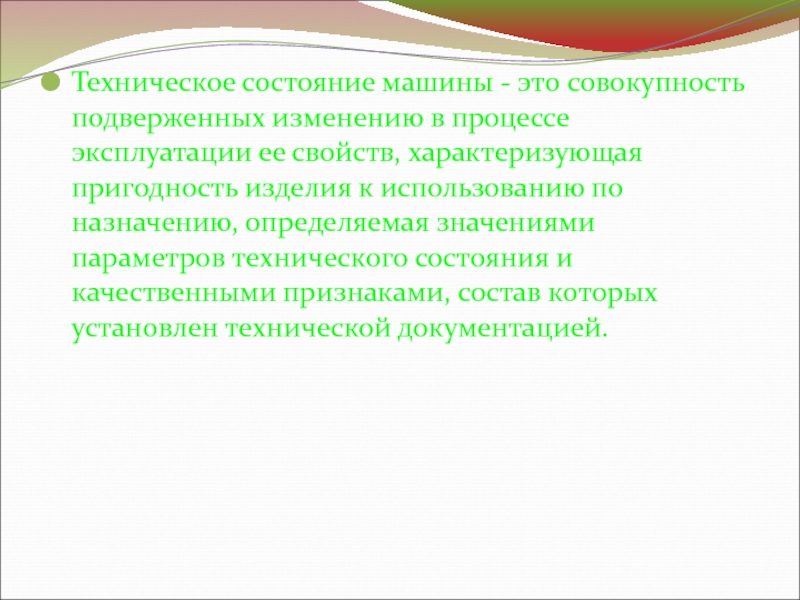 Слайд 10Техническое состояние машины - это совокупность подверженных изменению в процессе эксплуатации