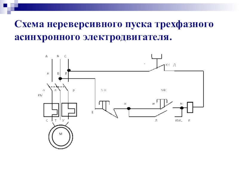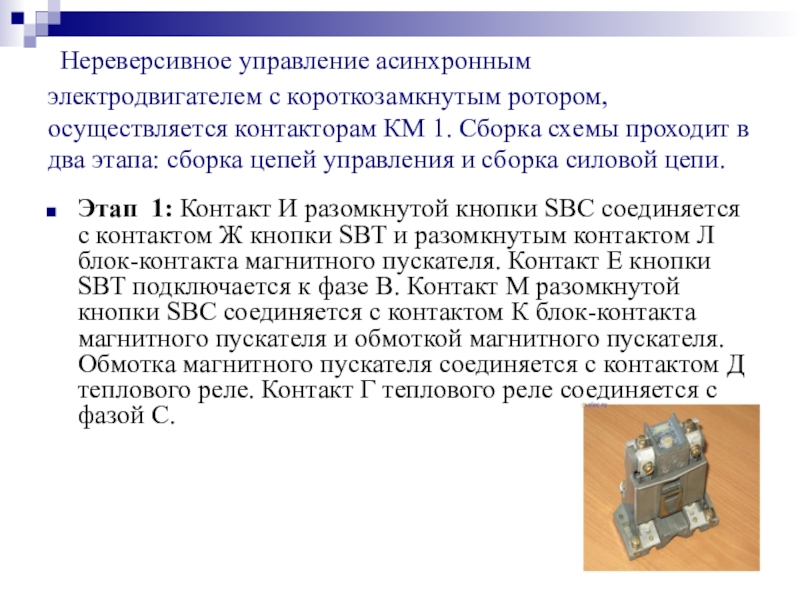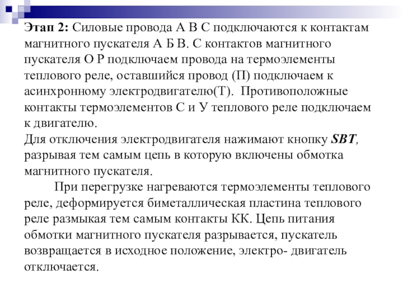 Этап 1: Контакт И разомкнутой кнопки SBC соединяется с контактом Ж кнопки SBT и разомкнутым контактом Л блок-контакта магнитного пускателя. Контакт Е кнопки SBT подключается к фазе В. Контакт М разомкнутой кнопки SBC соединяется с контактом К блок-контакта магнитного пускателя и обмоткой магнитного пускателя. Обмотка магнитного пускателя соединяется с контактом Д теплового реле. Контакт Г теплового реле соединяется с фазой С.
