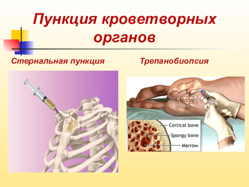 стернальной пункции или трепанобиопсии, позволяет оценить его клеточный состав, что помогает в диагностике лейкозов и некоторых анемий. Процентное соотношение клеточных элементов, подсчитанных в мазках из пунктатов костного мозга, называется миелограммой.