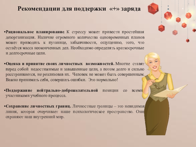 Рекомендации для поддержки «+» зарядаРациональное планирование. К стрессу может привести простейшая дезорганизация. Наличие огромного количества одновременных планов может