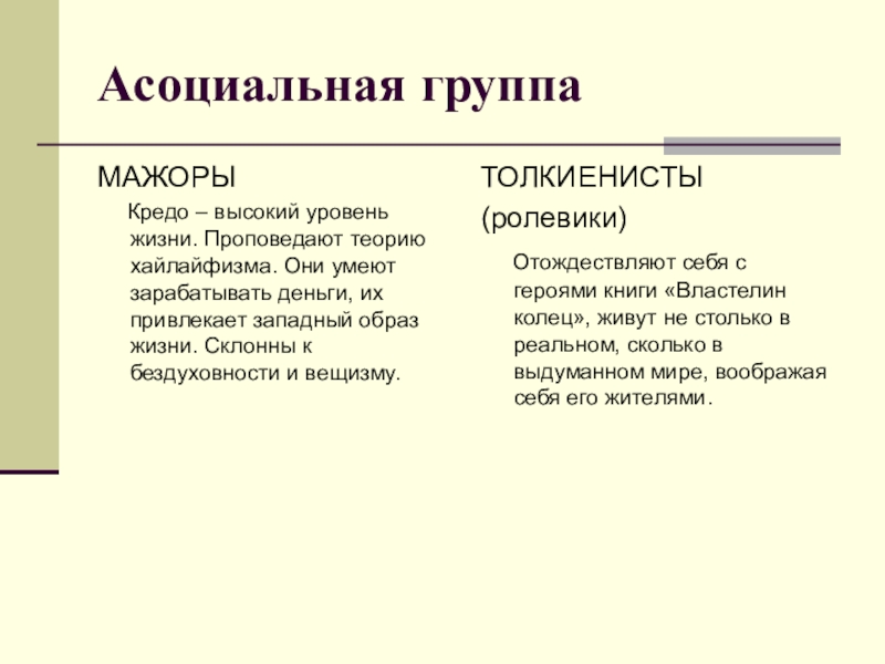 Отождествляют себя с героями книги «Властелин колец», живут не столько в реальном, сколько в выдуманном мире, воображая себя его жителями.