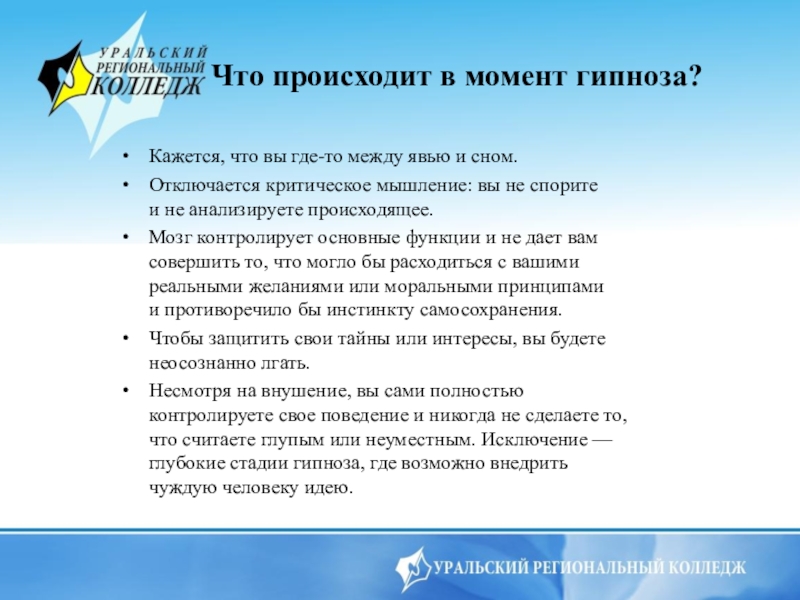 Что происходит в момент гипноза?Кажется, что вы где-то между явью и сном.Отключается критическое мышление: вы не спорите и не анализируете происходящее.Мозг контролирует основные
