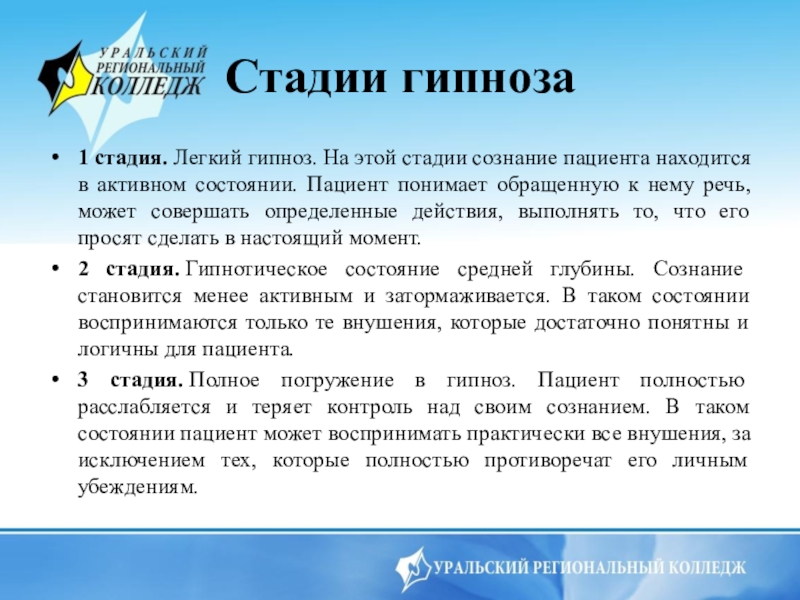 Стадии гипноза1 стадия. Легкий гипноз. На этой стадии сознание пациента находится в активном состоянии. Пациент понимает обращенную к