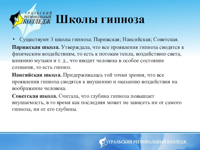 Школы гипноза Существуют 3 школы гипноза: Парижская; Нансийская; Советская.Парижская школа. Утверждала, что все проявления гипноза сводятся к физическим воздействиям,