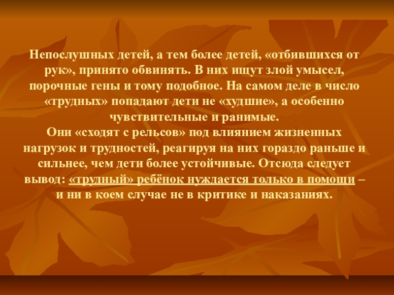 Слайд 8Непослушных детей, а тем более детей, «отбившихся от рук», принято обвинять.