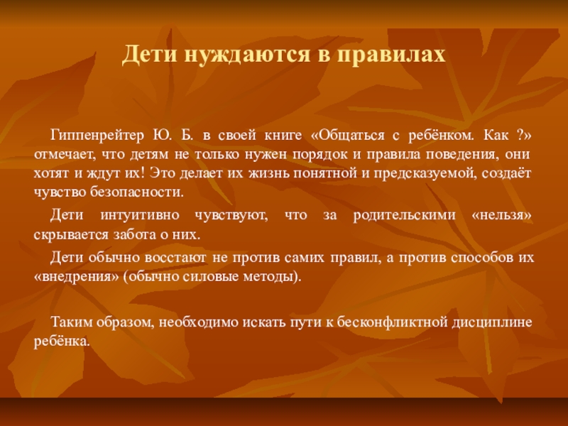 ребёнком. Как ?» отмечает, что детям не только нужен порядок и правила поведения, они хотят и ждут их! Это делает их жизнь понятной и предсказуемой, создаёт чувство безопасности.
