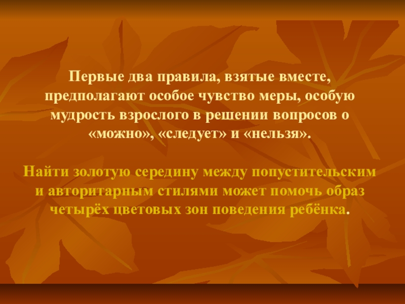 Слайд 13Первые два правила, взятые вместе, предполагают особое чувство меры, особую мудрость