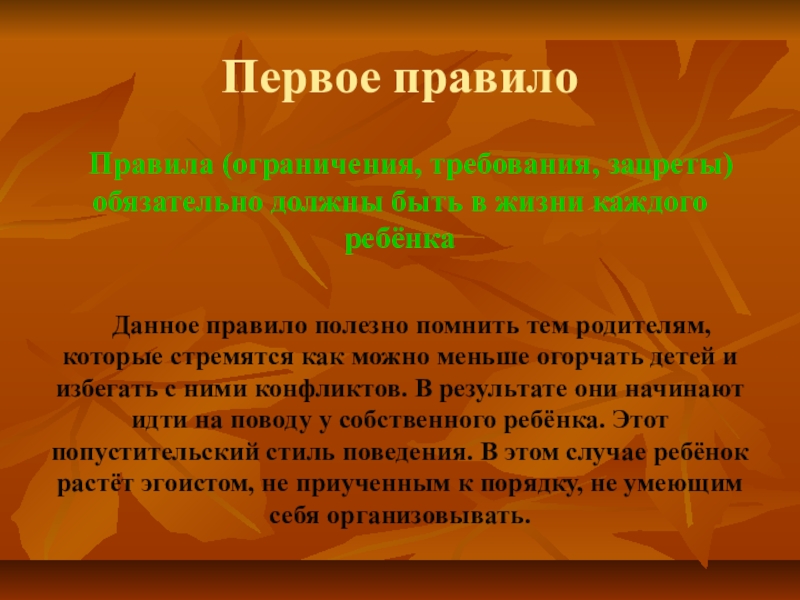 Данное правило полезно помнить тем родителям, которые стремятся как можно меньше огорчать детей и избегать с ними конфликтов. В результате они начинают идти на поводу у собственного ребёнка. Этот попустительский стиль поведения. В этом случае ребёнок растёт эгоистом, не приученным к порядку, не умеющим себя организовывать.