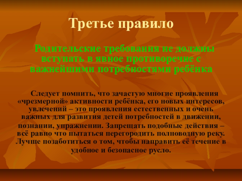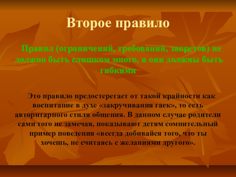 Это правило предостерегает от такой крайности как воспитание в духе «закручивания гаек», то есть авторитарного стиля общения. В данном случае родители сами того не замечая, показывают детям сомнительный пример поведения «всегда добивайся того, что ты хочешь, не считаясь с желаниями другого».