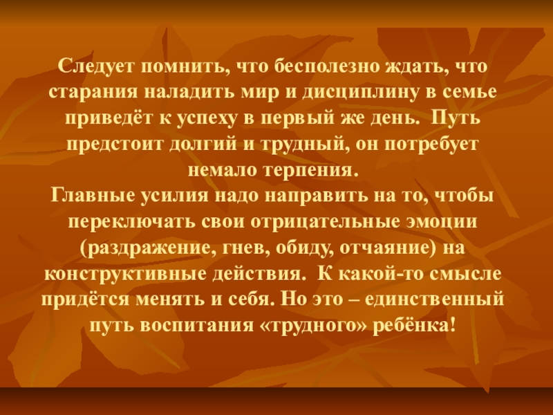 Главные усилия надо направить на то, чтобы переключать свои отрицательные эмоции (раздражение, гнев, обиду, отчаяние) на конструктивные действия. К какой-то смысле придётся менять и себя. Но это – единственный путь воспитания «трудного» ребёнка!