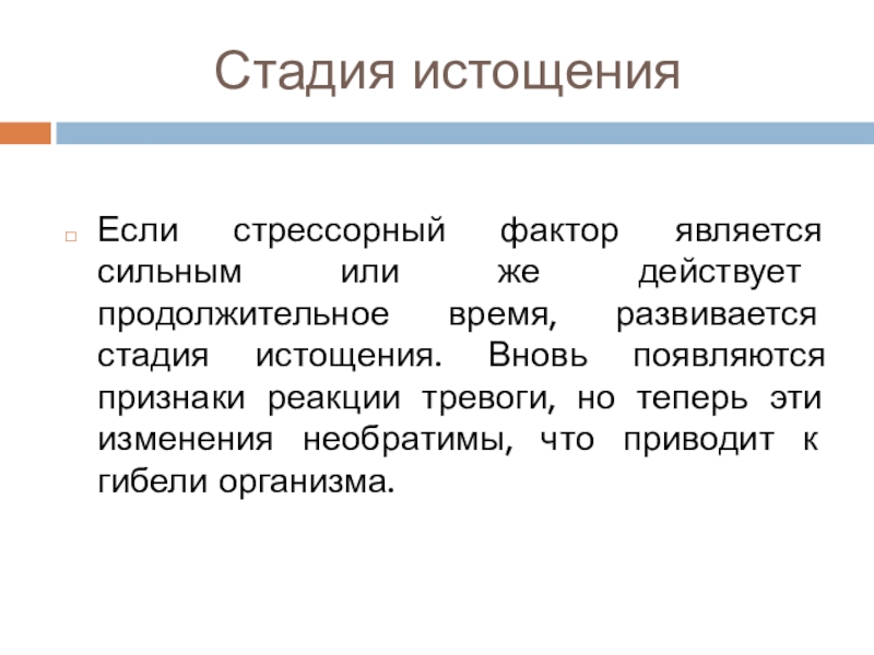 развивается стадия истощения. Вновь появляются признаки реакции тревоги, но теперь эти изменения необратимы, что приводит к гибели организма.