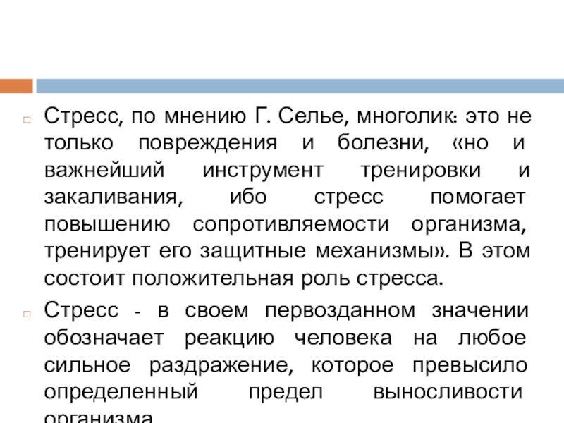 Слайд 4Стресс, по мнению Г. Селье, многолик: это не только повреждения и болезни,