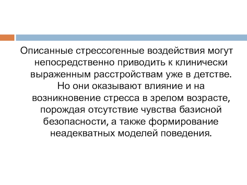 в детстве. Но они оказывают влияние и на возникновение стресса в зрелом возрасте, порождая отсутствие чувства базисной безопасности, а также формирование неадекватных моделей поведения.
