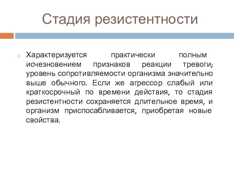 значительно выше обычного. Если же агрессор слабый или краткосрочный по времени действия, то стадия резистентности сохраняется длительное время, и организм приспосабливается, приобретая новые свойства.