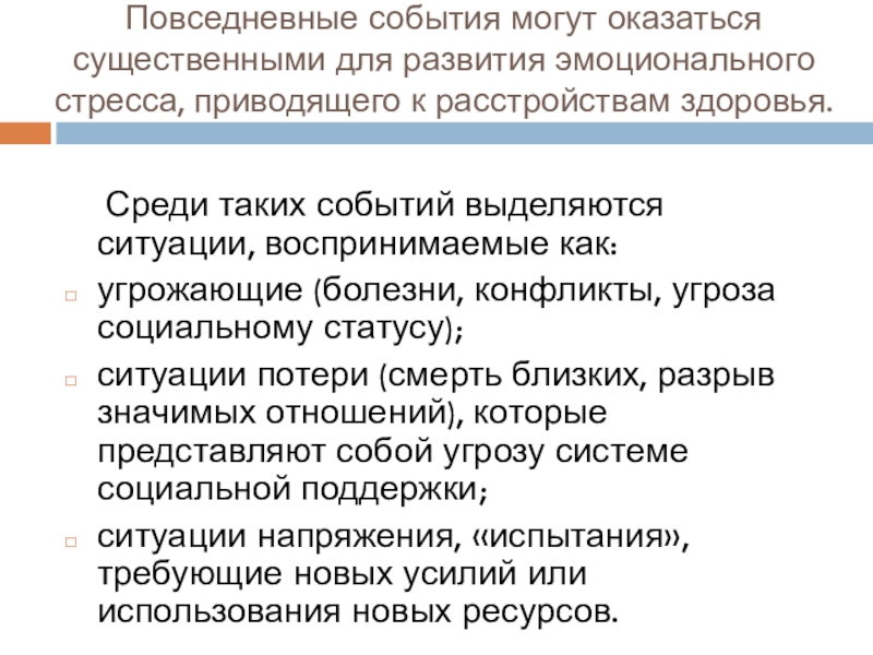 Слайд 19Повседневные события могут оказаться существенными для развития эмоционального стресса, приводящего к