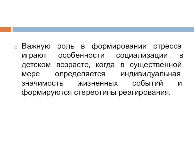 Слайд 20Важную роль в формировании стресса играют особенности социализации в детском возрасте,