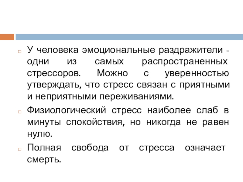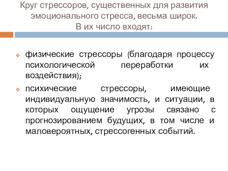 Слайд 17Круг стрессоров, существенных для развития эмоционального стресса, весьма широк.