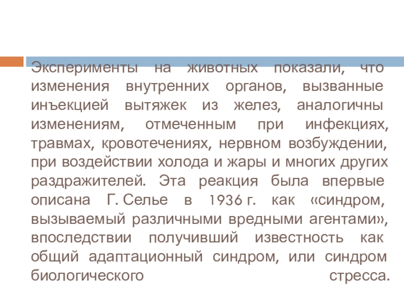 из желез, аналогичны изменениям, отмеченным при инфекциях, травмах, кровотечениях, нервном возбуждении, при воздействии холода и жары и многих других раздражителей. Эта реакция была впервые описана Г. Селье в 1936 г. как «синдром, вызываемый различными вредными агентами», впоследствии получивший известность как общий адаптационный синдром, или синдром биологического стресса.