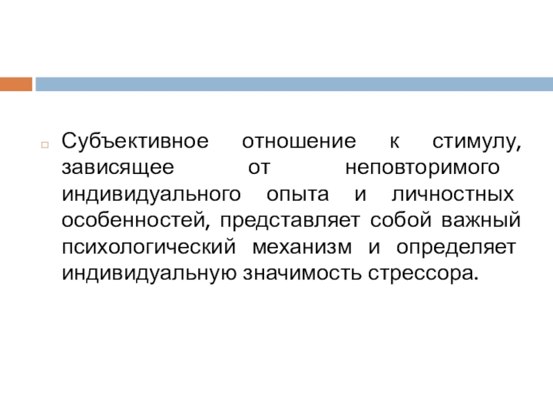 Слайд 18Субъективное отношение к стимулу, зависящее от неповторимого индивидуального опыта и личностных