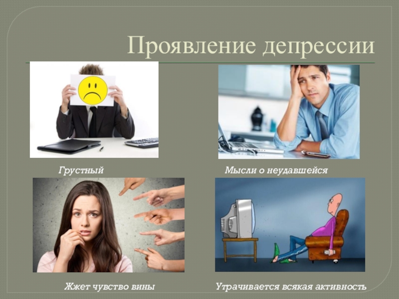 Проявление депрессииГрустный человекМысли о неудавшейся жизниЖжет чувство виныУтрачивается всякая активность