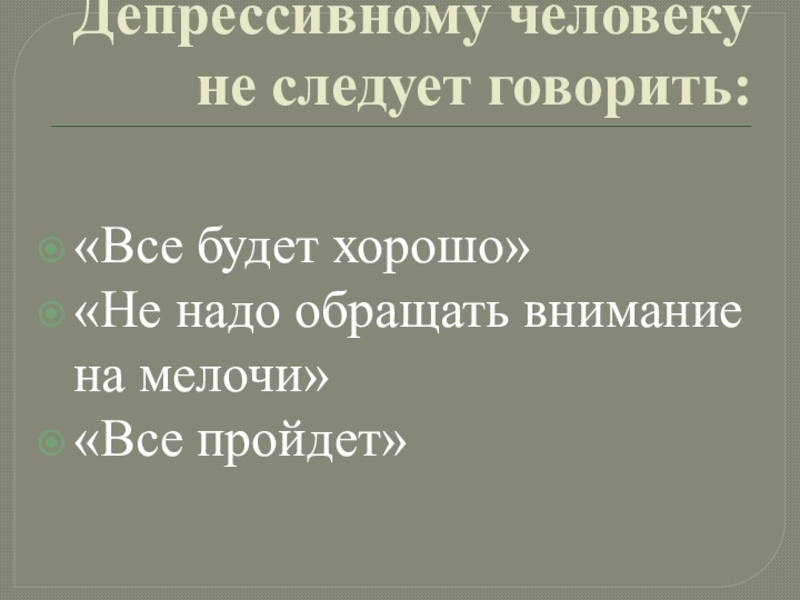 Депрессивному человеку не следует говорить:«Все будет хорошо»«Не надо обращать внимание на мелочи»«Все пройдет»