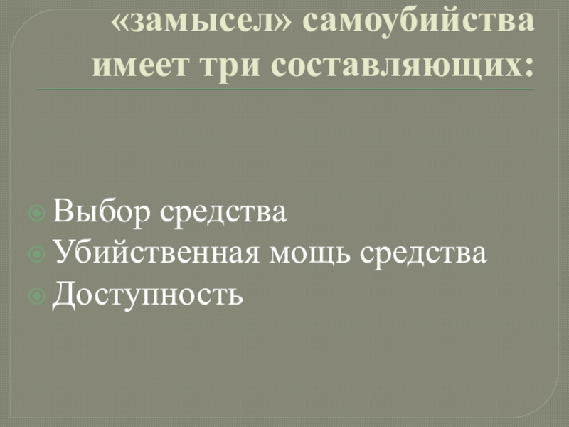 Слайд 9 По мнению Претзел «замысел» самоубийства имеет три составляющих: