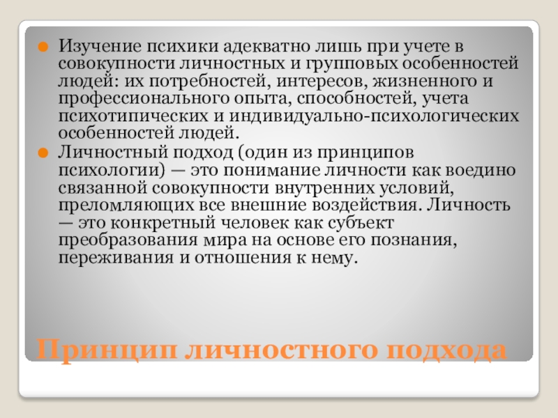Личностный подход (один из принципов психологии) — это понимание личности как воедино связанной совокупности внутренних условий, преломляющих все внешние воздействия. Личность — это конкретный человек как субъект преобразования мира на основе его познания, переживания и отношения к нему.