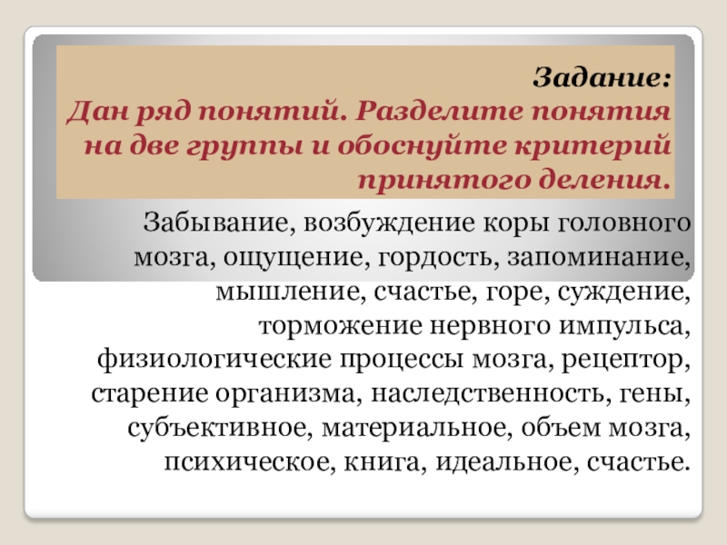 Забывание, возбуждение коры головного мозга, ощущение, гордость, запоминание, мышление, счастье, горе, суждение, торможение нервного импульса, физиологические процессы мозга, рецептор, старение организма, наследственность, гены, субъективное, материальное, объем мозга, психическое, книга, идеальное, счастье.