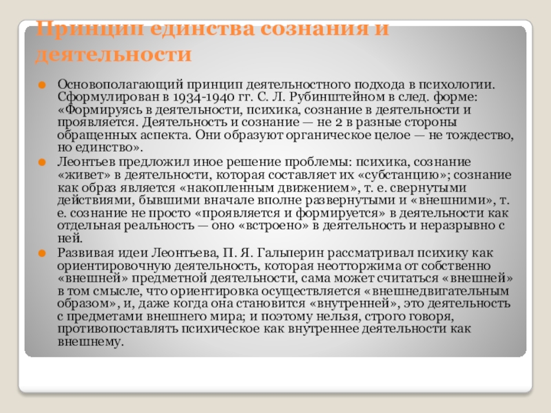 в 1934-1940 гг. С. Л. Рубинштейном в след. форме: «Формируясь в деятельности, психика, сознание в деятельности и проявляется. Деятельность и сознание — не 2 в разные стороны обращенных аспекта. Они образуют органическое целое — не тождество, но единство».