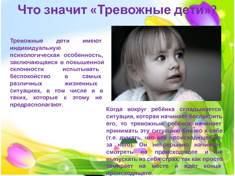 Когда вокруг ребёнка складывается ситуация, которая начинает беспокоить его, то тревожный ребёнок начинает принимать эту ситуацию близко к себе (т.е. думать, что всё происходящее из-за него). Он непрерывно начинает смотреть на происходящее и не выпускать из себя страх, так как просто замирает на месте и ждёт конца происходящего.