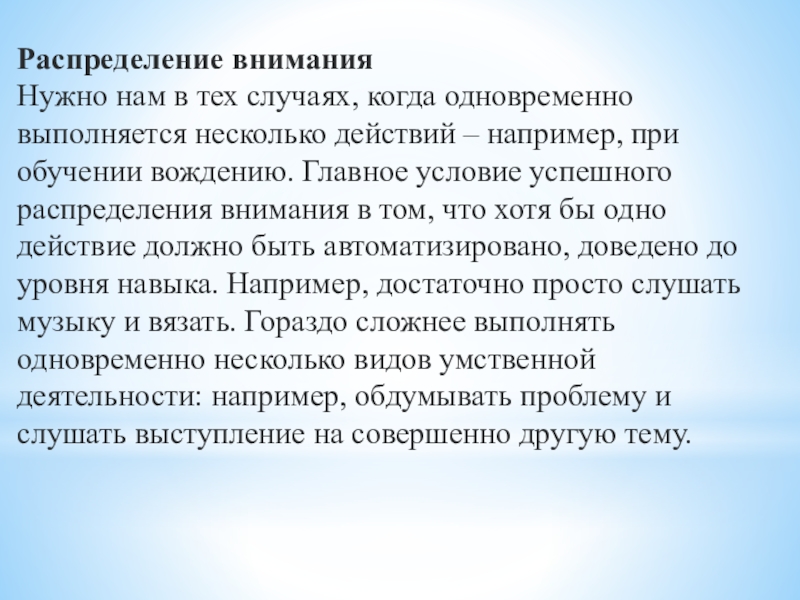 – например, при обучении вождению. Главное условие успешного распределения внимания в том, что хотя бы одно действие должно быть автоматизировано, доведено до уровня навыка. Например, достаточно просто слушать музыку и вязать. Гораздо сложнее выполнять одновременно несколько видов умственной деятельности: например, обдумывать проблему и слушать выступление на совершенно другую тему.