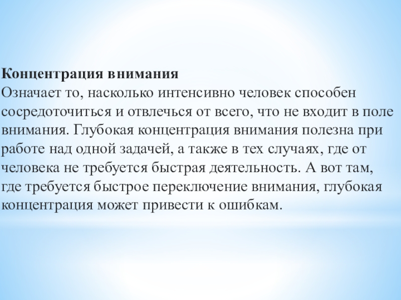 всего, что не входит в поле внимания. Глубокая концентрация внимания полезна при работе над одной задачей, а также в тех случаях, где от человека не требуется быстрая деятельность. А вот там, где требуется быстрое переключение внимания, глубокая концентрация может привести к ошибкам.